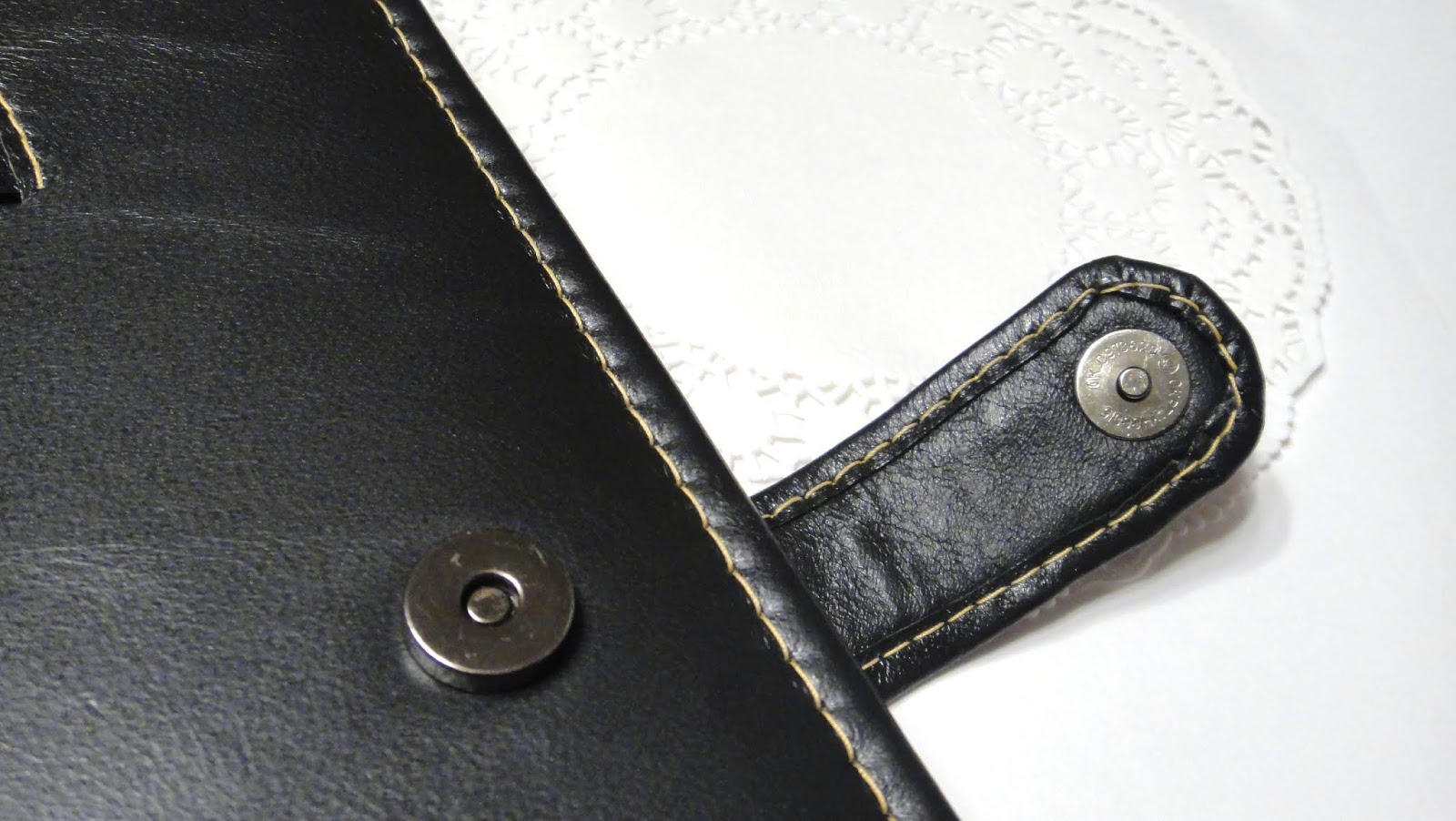 Накидной ремешок на кнопке, чтобы удерживать содержимое органайзера. В верхнем углу справа - две петли для ручек, внизу справа - инициалы.